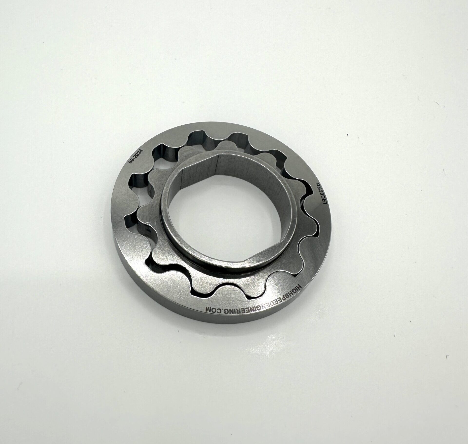 BILLET EN26 oil pump gears for the Nissan RB20 engine. These gears are direct replacements for the OEM Oil Pump and measure approximately Ø81mm OD and 9.5mm thick (outer gear).