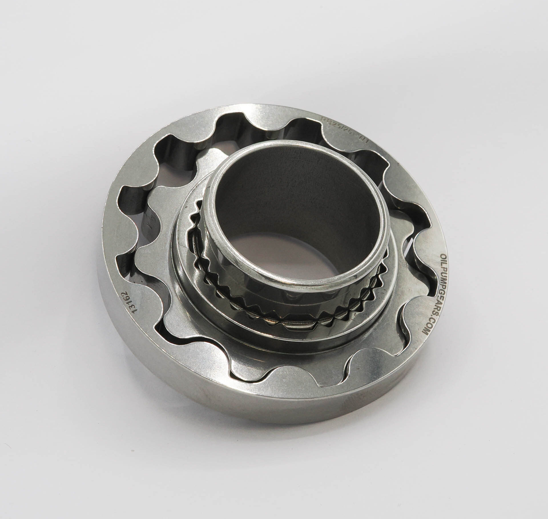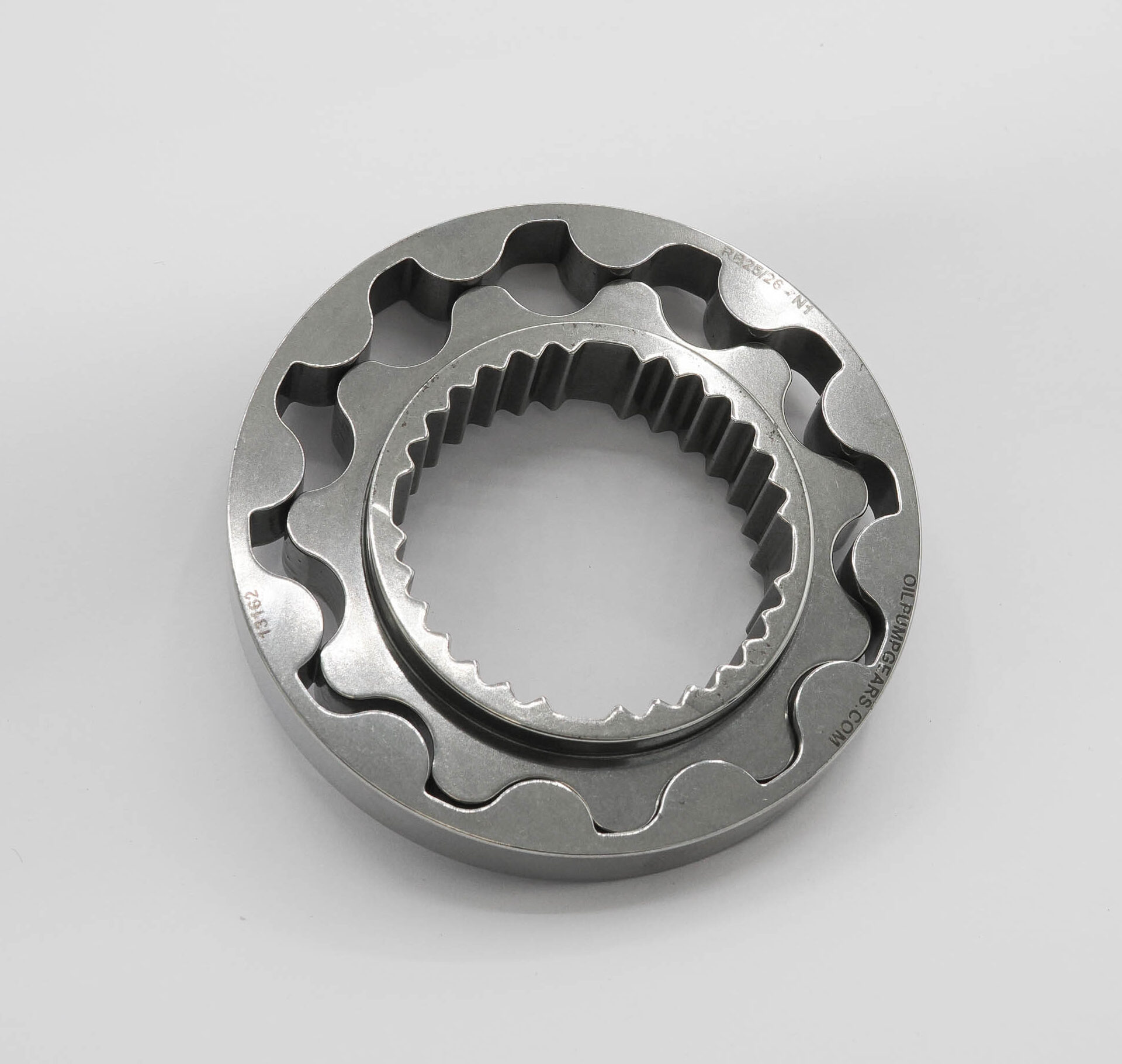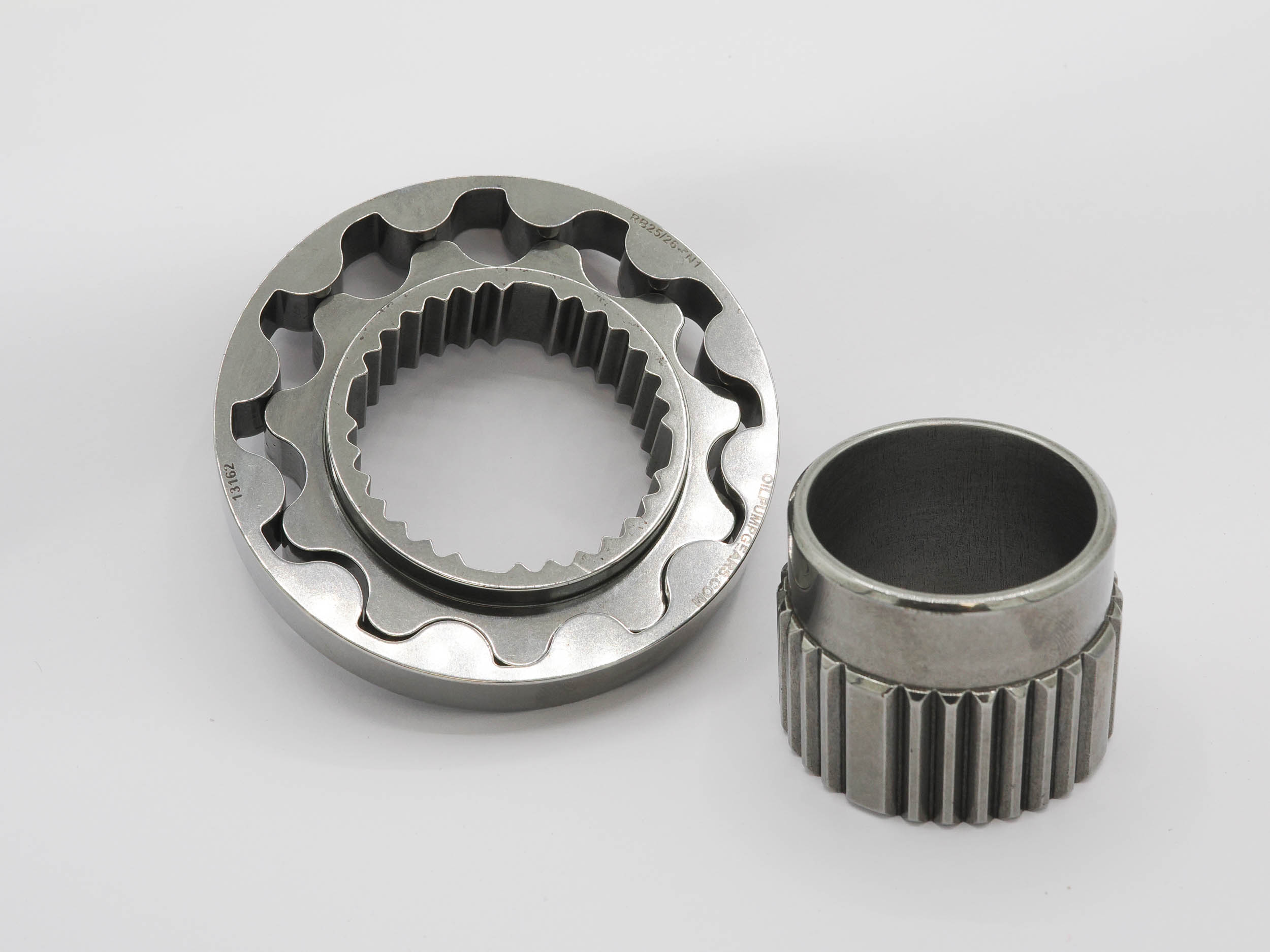 BILLET EN26 oil pump gears for the Nissan RB25/26 engine. These gears are direct replacements for the N1 Oil Pump with upgraded splined quad key collar and measure approximately Ø77mm OD and 11mm thick (outer gear).